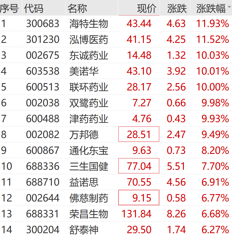 个股方面,东诚药业、美诺华、联环药业、双鹭药业等纷纷涨停,泓博医药、海特生物等涨超10%。
