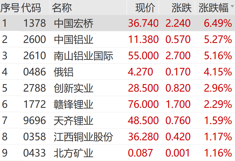 港股有色金属同步走强,中国宏桥、中国铝业、南山铝业国际等大涨。
