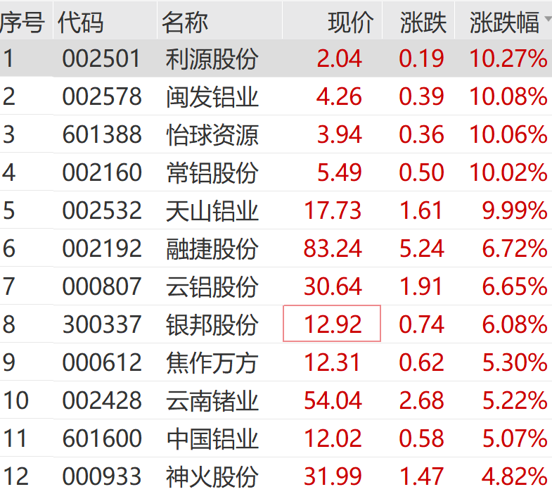 个股方面,闽发铝业、怡球资源、常铝股份、天山铝业竞价涨停,利源股份开盘1分钟触及涨停,融捷股份、云铝股份、中国铝业等跟涨。