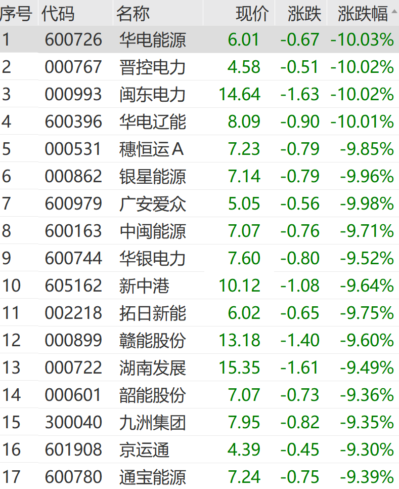 3月30日上午,部分资金撤离前期热门赛道,电力股集体跳水。华电能源、晋控电力、闽东电力、华电辽能等多股跌停,华银电力、赣能股份等跌超9%。