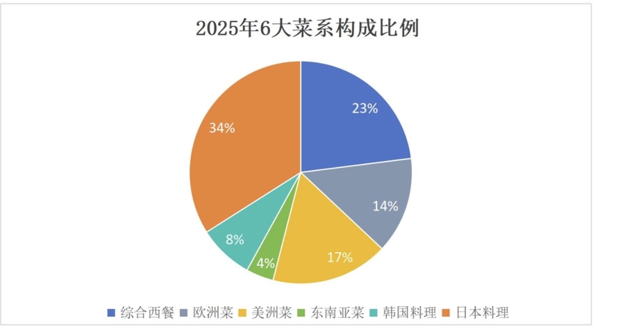 4.区域性菜系调整幅度较大并且增长乏力。本指数所分类的六大菜系中,除综合性西餐外,其余为区域性特征的菜系。但由于美洲菜系中品牌连锁快餐占比大,所以它的增长速度仍然最快,其次为综合性西餐。而另外4类区域性菜系中,缩减量最大的为韩国菜,其次是东南亚菜,第三为欧洲菜。从市场反映看,区域菜系特征明显的门店,往往有特定的消费群体,对大多数消费者而言,其接受度和选择性受到制约。由此可见,随着餐饮消费品类选择性的增加,区域性菜系门店遇到的压力和挑战更大。如韩国菜从2023年的1138家,降至2025年的779家,减少了31.55%。