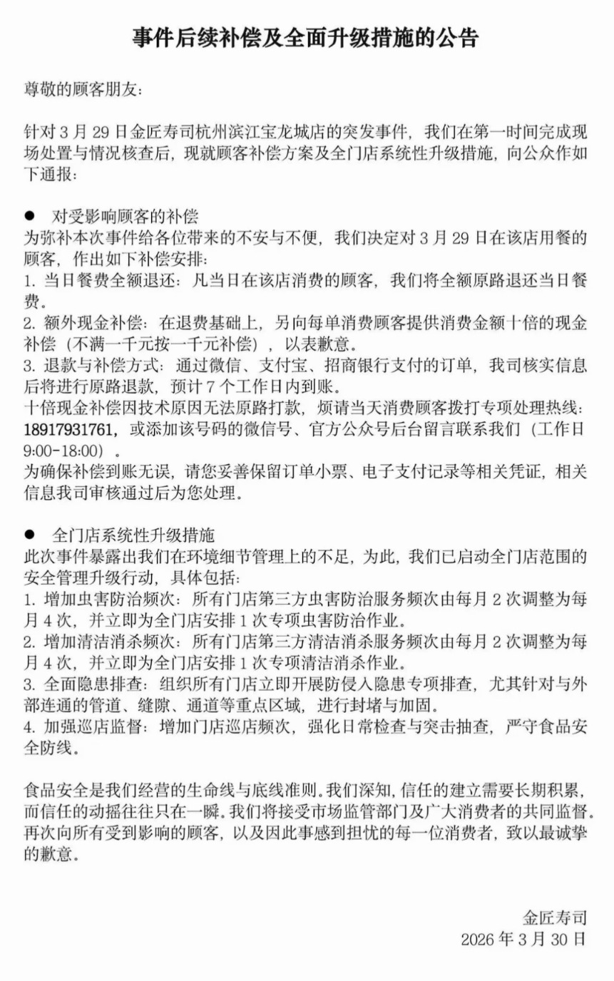 3月30日中午,金匠寿司发布“事件后续补偿及全面升级措施的公告”,对3月29日在该店用餐的顾客,作出如下补偿安排:1.当日餐费全额退还:凡当日在该店消费的顾客,将全额原路退还当日餐费。2.额外现金补偿:在退费基础上,另向每单消费顾客提供消费金额十倍的现金补偿(不满一千元按一千元补偿),以表歉意。3.退款与补偿方式:通过微信、支付宝、招商银行支付的订单,进行原路退款,预计7个工作日内到账。十倍现金补偿因技术原因无法原路打款,当天消费顾客请拨打专项处理热线。