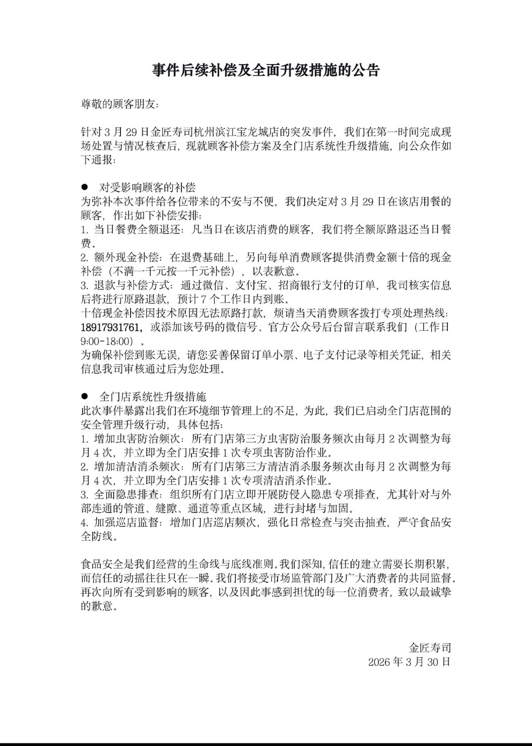 3月30日,金匠寿司针对3月29日金匠寿司杭州滨江宝龙城店的突发事件,公布就顾客补偿方案及全门店系统性升级的措施。
