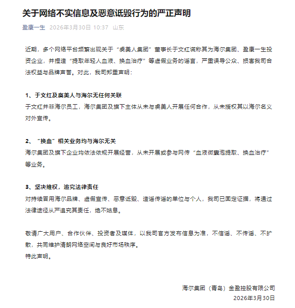 3月30日,海尔金控发布声明称,近期,多个网络平台频繁出现关于“虞美人集团”董事长于文红谎称其为海尔集团、盈康一生投资企业,并捏造“提取年轻人血液、换血治疗”等虚假业务的谣言。“公司声明,于文红并非海尔员工,海尔集团及旗下主体从未与虞美人开展任何合作,从未授权其以海尔名义对外宣传。”