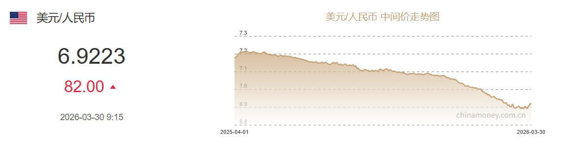 中新网3月30日电据中国外汇交易中心网站消息,中国人民银行授权中国外汇交易中心公布,2026年3月30日银行间外汇市场人民币汇率中间价为:1美元对人民币6.9223元,下调82个基点。