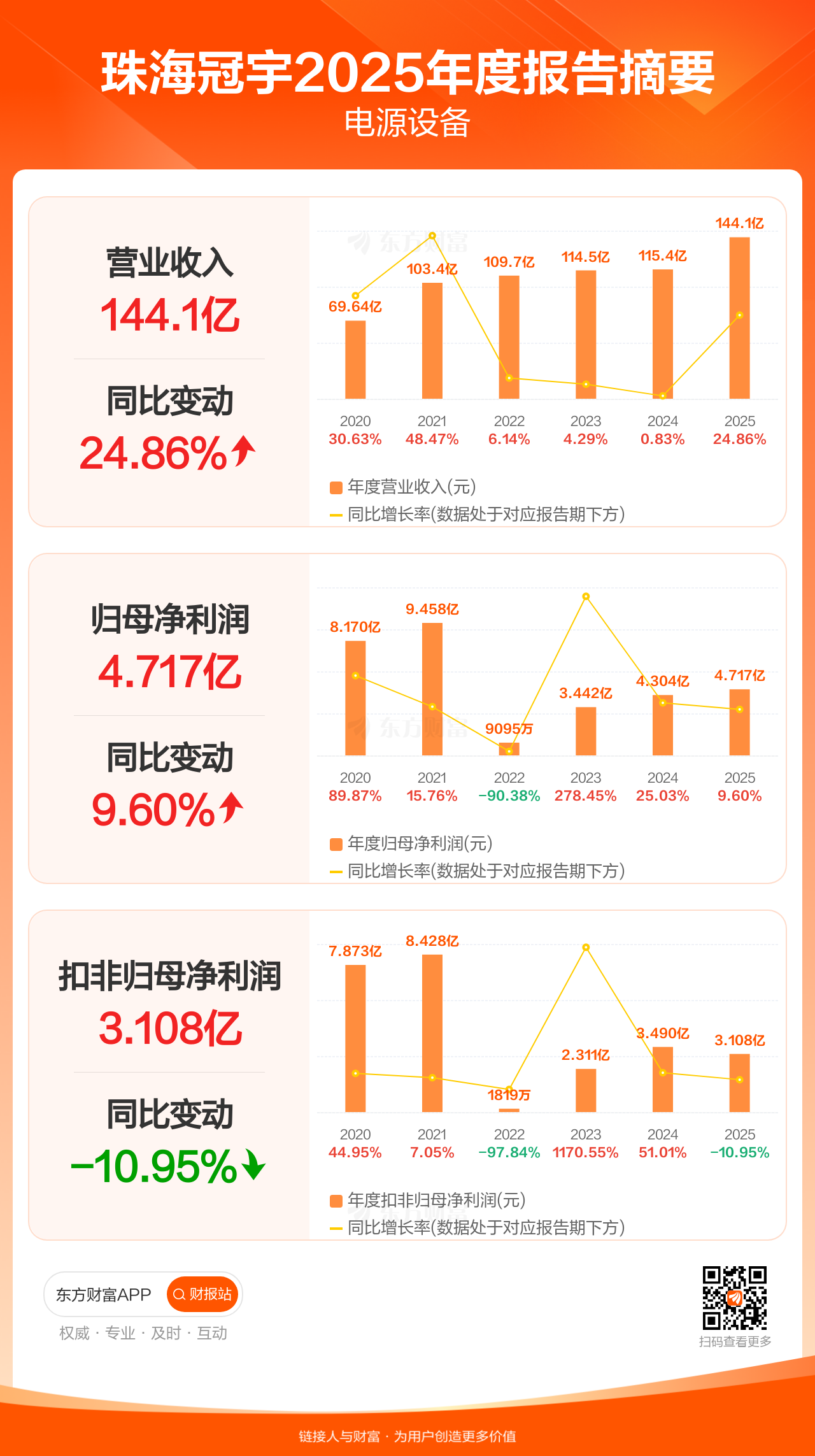 珠海冠宇3月31日发布2025年年报显示,公司全年实现营业收入144.10亿元,同比增长24.86%;归母净利润4.72亿元,同比增长9.60%;扣非归母净利润3.11亿元,同比下滑10.95%。