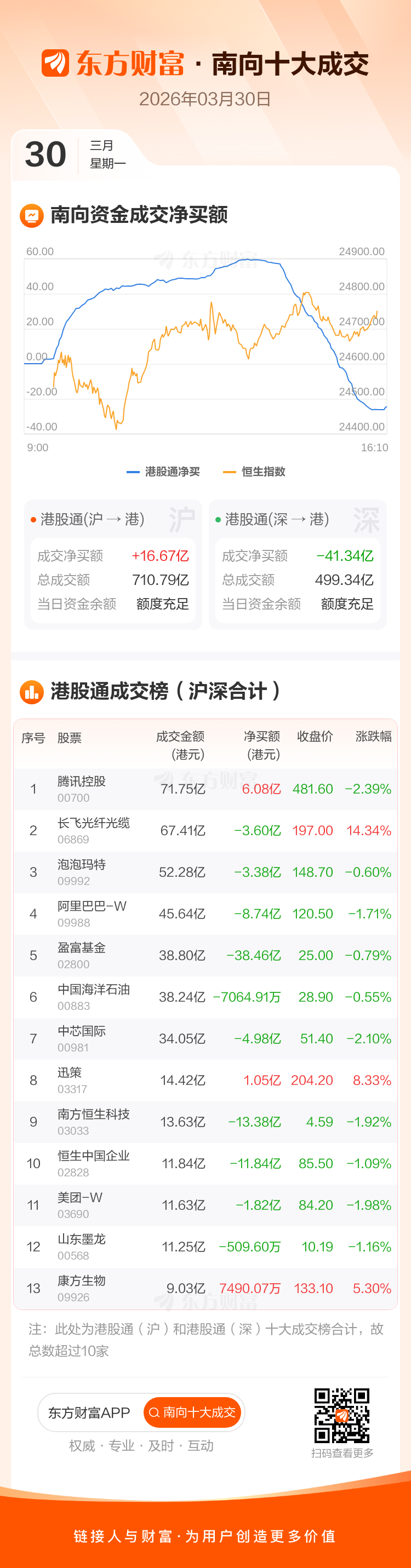 3月30日南向资金净卖近25亿港元,逾6亿抢筹腾讯控股