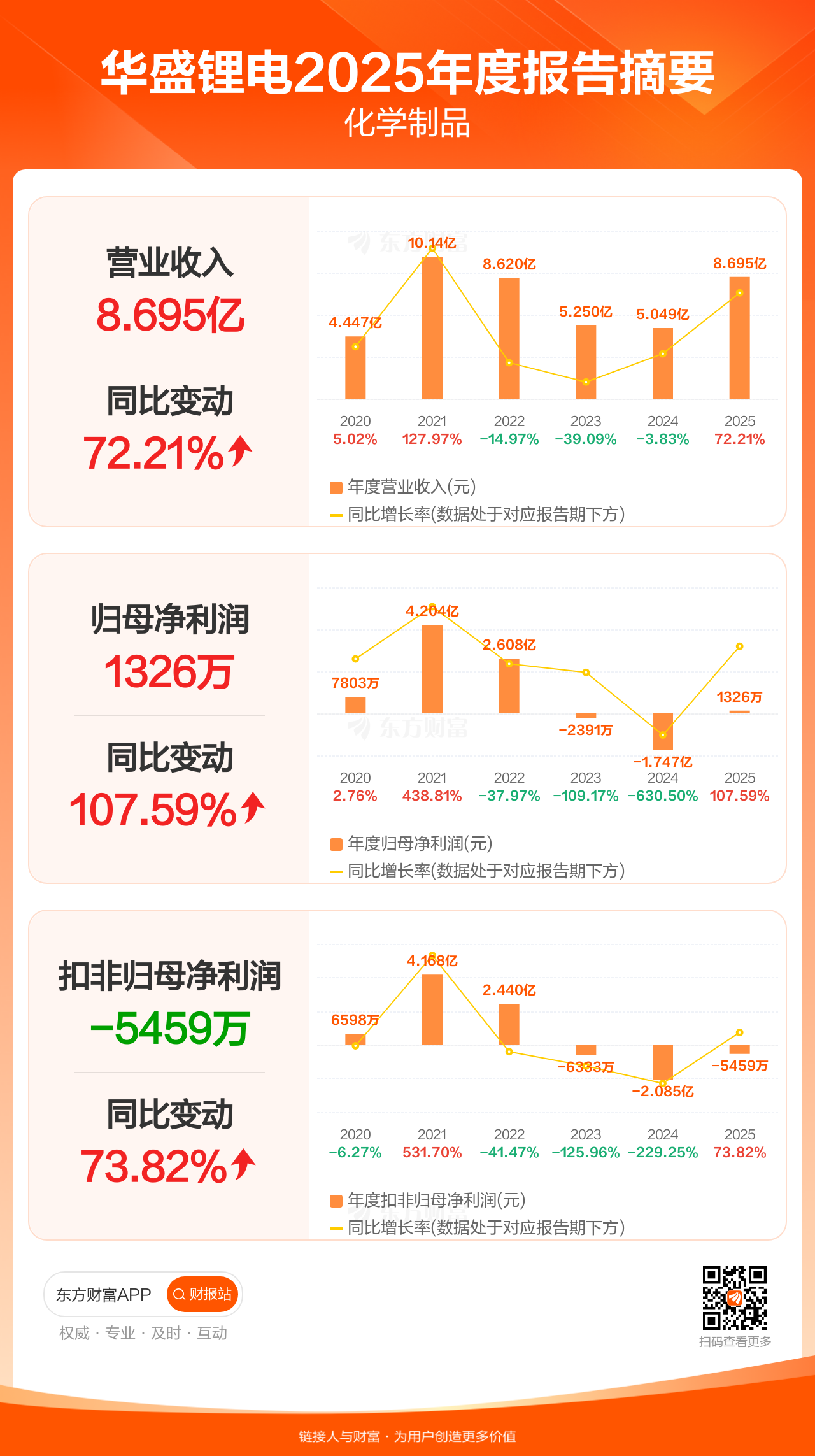 华盛锂电3月31日发布2025年年报显示,公司全年实现营业收入8.69亿元,同比增长72.21%;归母净利润1325.66万元,同比增长107.59%;扣非归母净利润-5459.43万元。