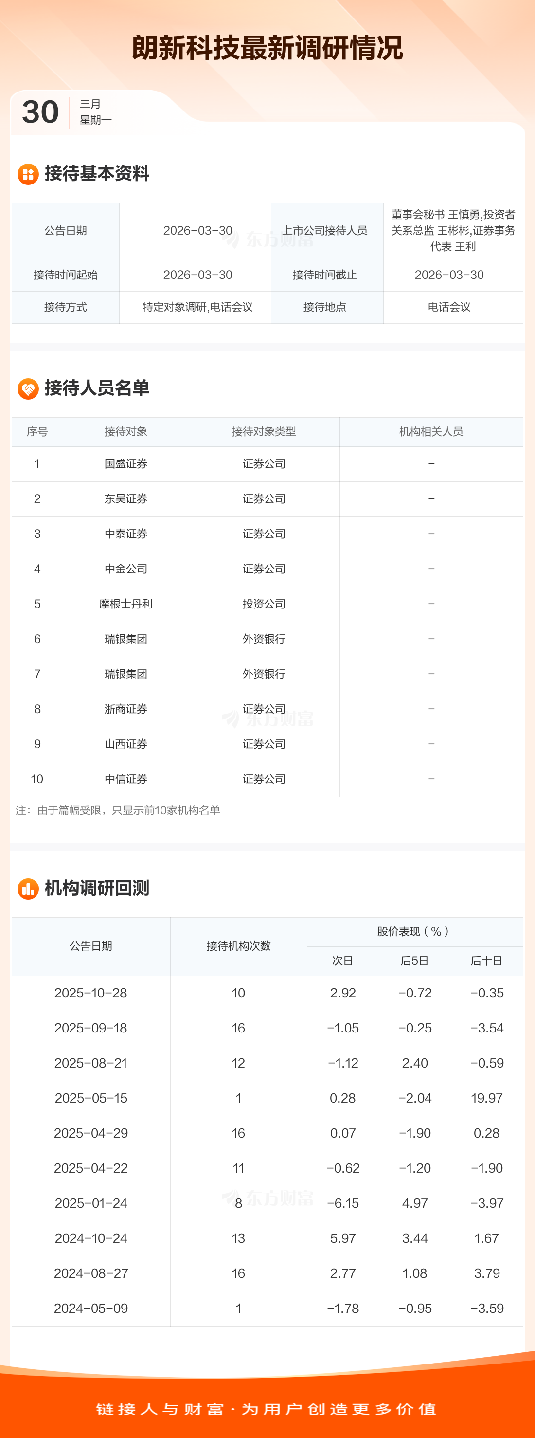 朗新科技3月30日公告称,3月30日接待国盛证券等15家机构调研。接待人员包括董事会秘书 王慎勇,投资者关系总监 王彬彬,证券事务代表 王利。