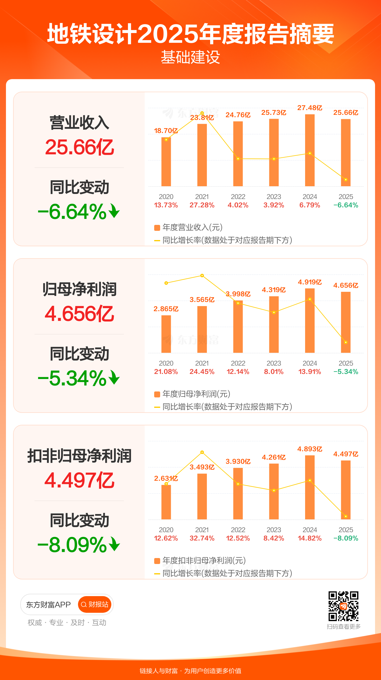 地铁设计3月31日发布2025年年报显示,公司全年实现营业收入25.66亿元,同比下滑6.64%;归母净利润4.66亿元,同比下滑5.34%;扣非归母净利润4.50亿元,同比下滑8.09%。
