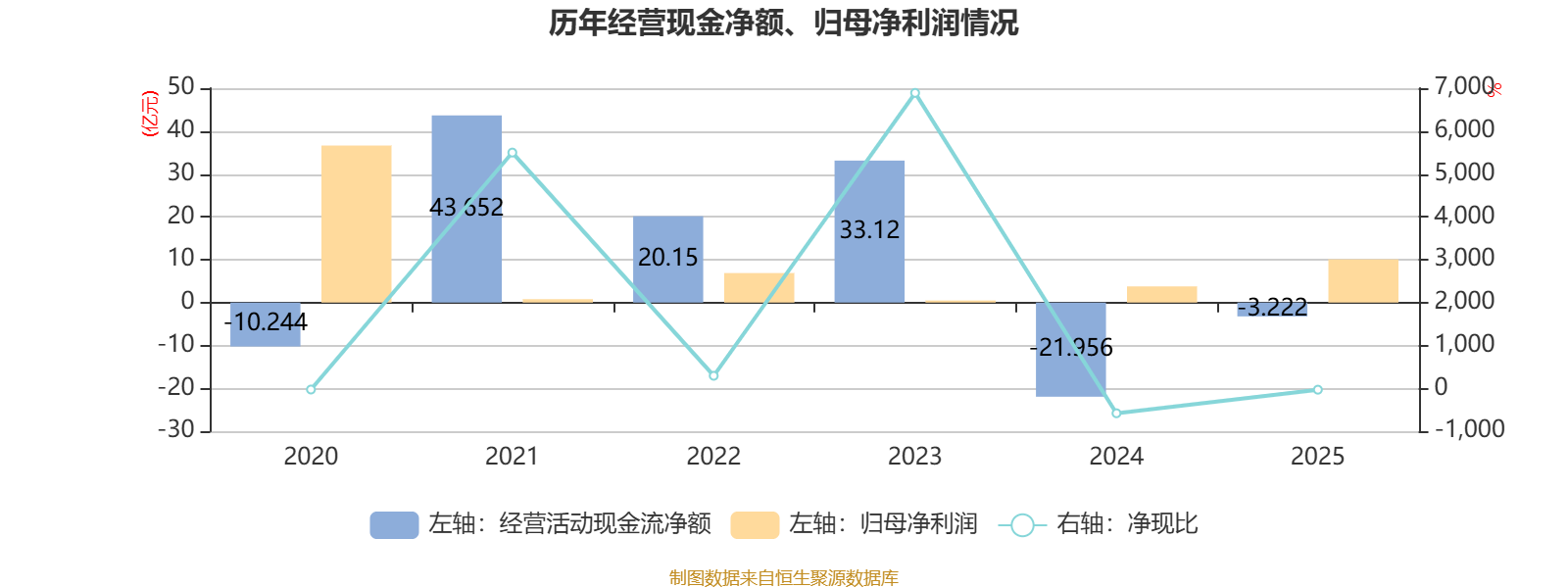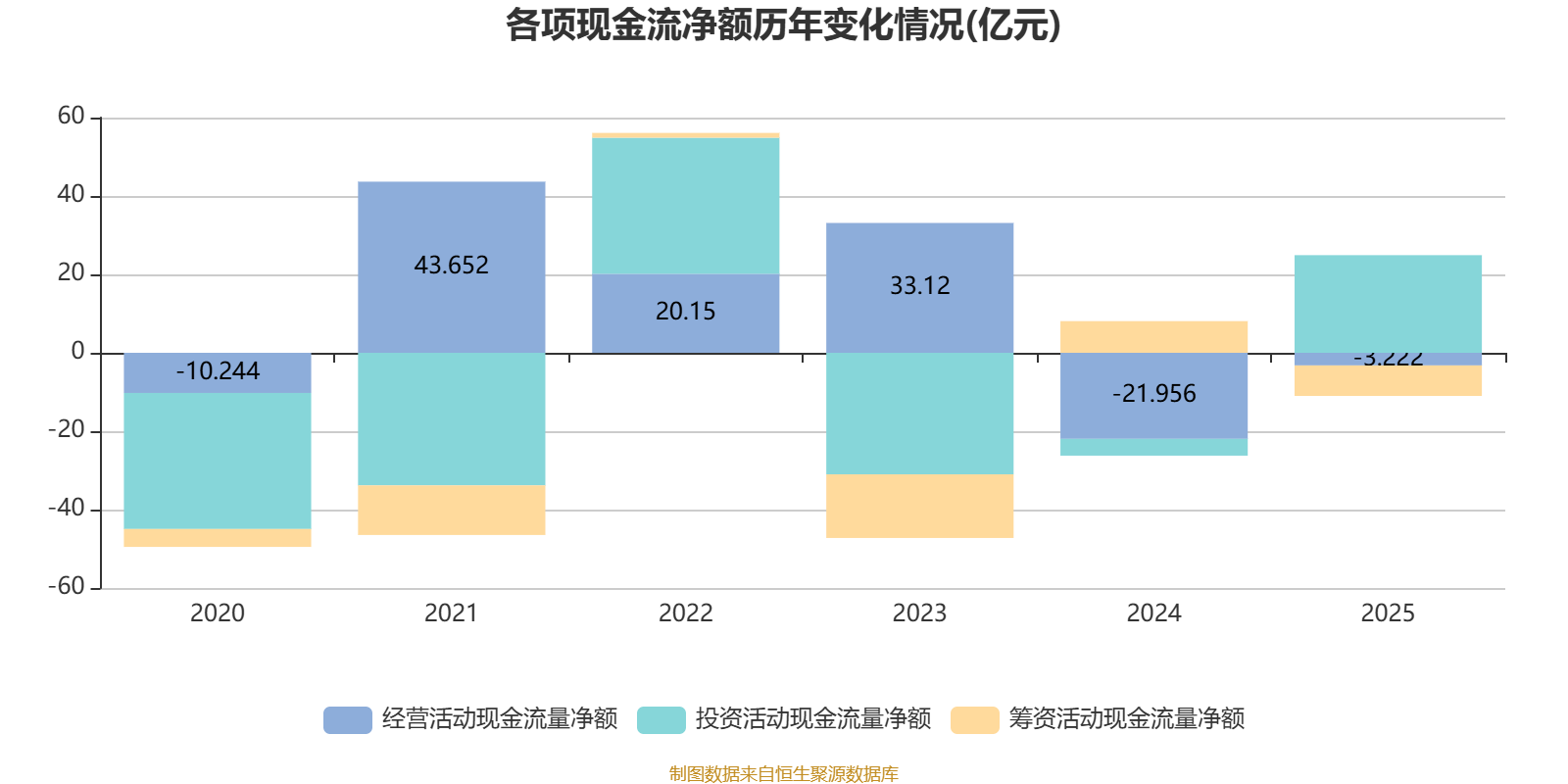2025年,公司经营活动现金流净额为-3.22亿元,同比增加18.73亿元;筹资活动现金流净额-7.78亿元,同比减少15.85亿元;投资活动现金流净额24.91亿元,上年同期为-4.28亿元。