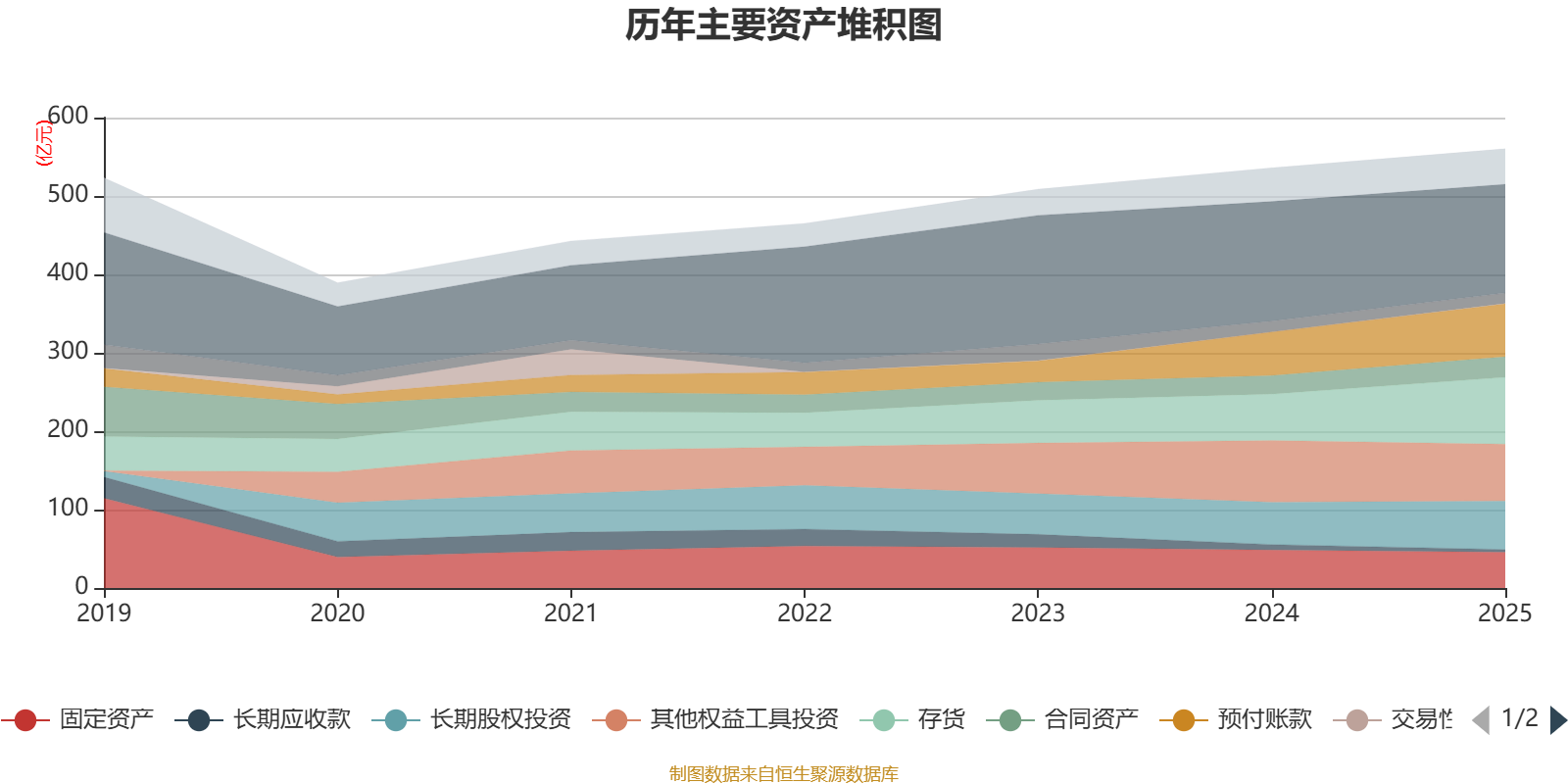 资产重大变化方面,截至2025年末,公司存货较上期末增加44.41%,占公司总资产比重上升4.2个百分点;货币资金较上期末减少9.21%,占公司总资产比重下降3.74个百分点;预付账款较上期末增加22%,占公司总资产比重上升1.73个百分点;其他权益工具投资较上期末减少7.81%,占公司总资产比重下降1.73个百分点。