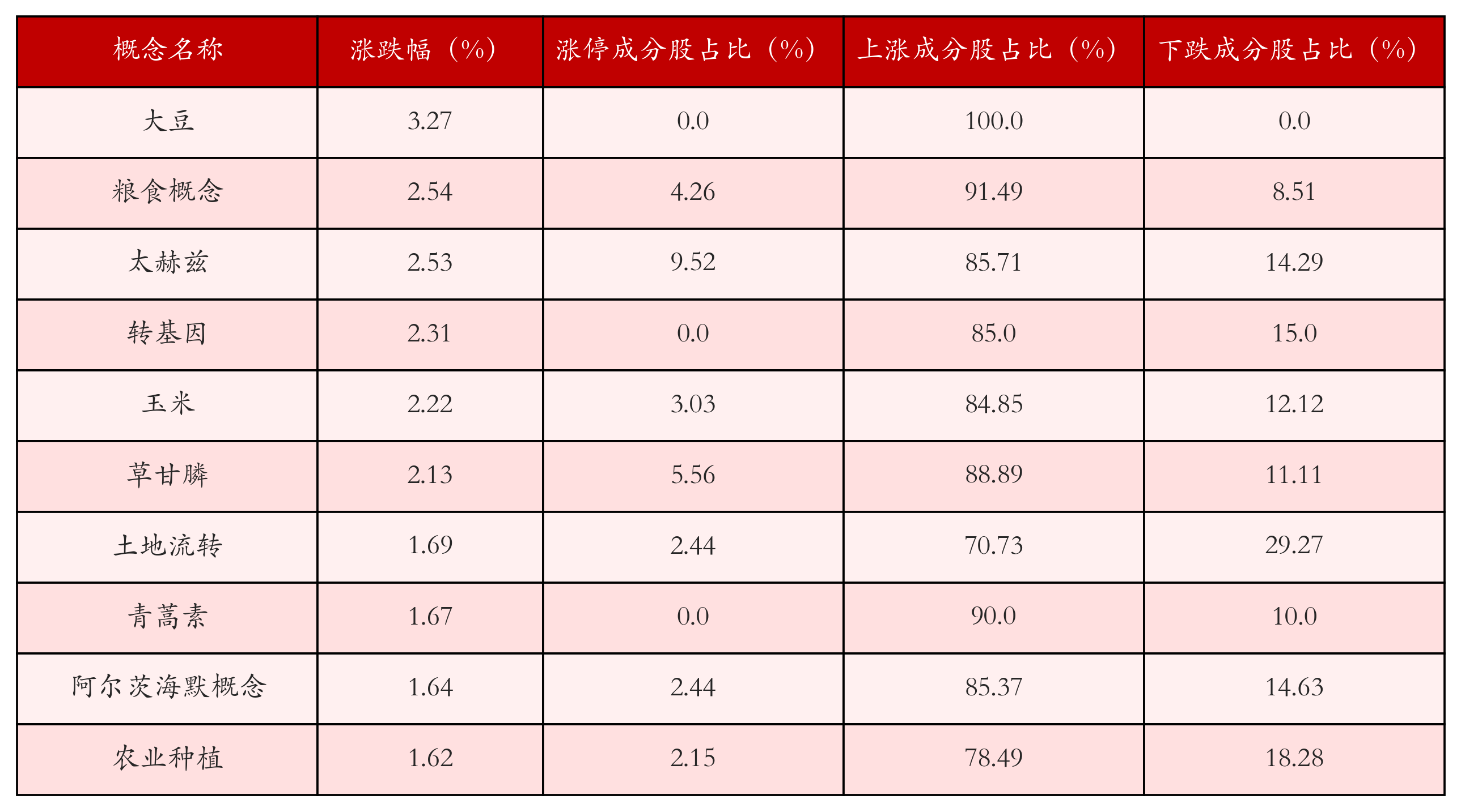 根据A股概念涨跌幅与所对应的股票池综合分析,涨幅靠前的三个概念板块分别为:大豆、粮食概念与太赫兹。排名前10位的概念板块相关数据见下表: