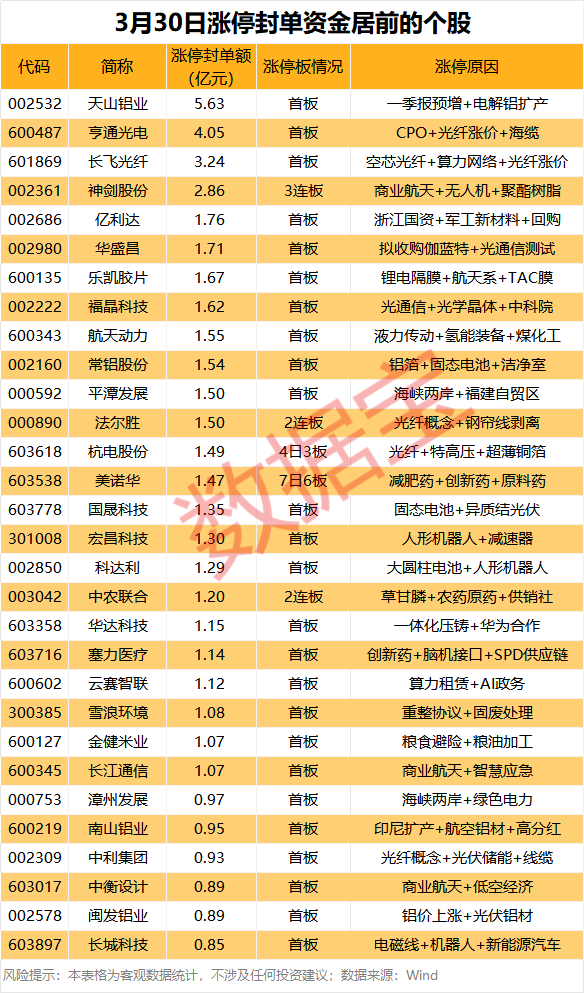 从连续涨停天数看,ST瑞和已连收6个涨停板,连续涨停板数量最多。以封单金额计算,天山铝业、亨通光电、长飞光纤涨停板封单资金居前,分别为5.63亿元、4.05亿元、3.24亿元。