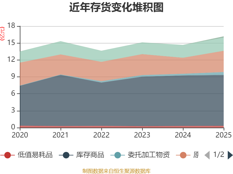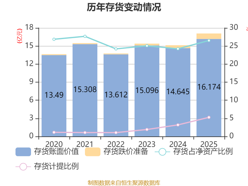 从存货变动来看,截至2025年末,公司存货账面价值为16.17亿元,占净资产的26.51%,较上年末增加1.53亿元。其中,存货跌价准备为9000.68万元,计提比例为5.27%。