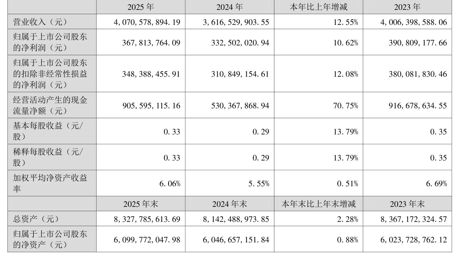 中证智能财讯天润工业(002283)3月31日披露2025年年度报告。2025年,公司实现营业总收入40.71亿元,同比增长12.55%;归母净利润3.68亿元,同比增长10.62%;扣非净利润3.48亿元,同比增长12.08%;经营活动产生的现金流量净额为9.06亿元,同比增长70.75%;报告期内,天润工业基本每股收益为0.33元,加权平均净资产收益率为6.06%。公司2025年度分配预案为:拟向全体股东每10股派现2.2元(含税)。