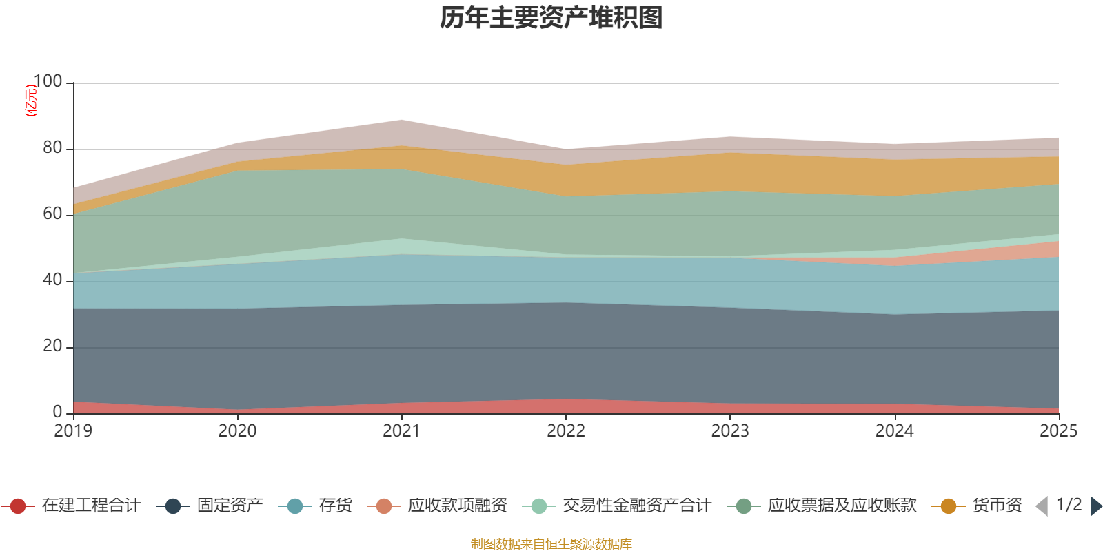 资产重大变化方面,截至2025年末,公司货币资金较上年末减少24.39%,占公司总资产比重下降3.54个百分点;应收款项融资较上年末增加86.45%,占公司总资产比重上升2.6个百分点;固定资产较上年末增加9.77%,占公司总资产比重上升2.43个百分点;在建工程合计较上年末减少50.4%,占公司总资产比重下降1.83个百分点。