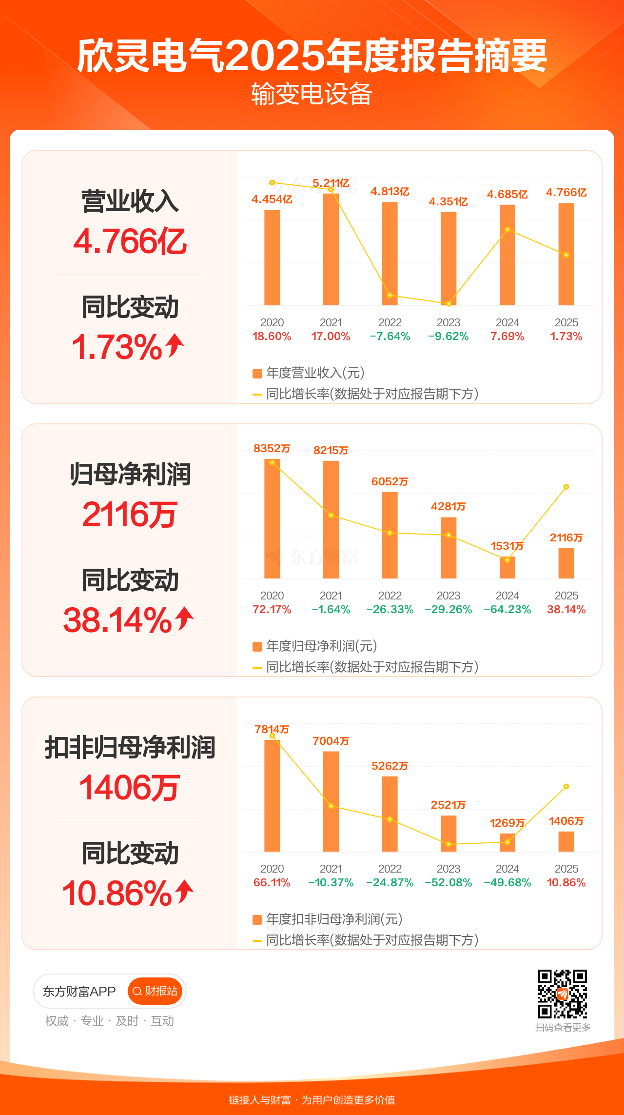 欣灵电气3月31日发布2025年年报显示,公司全年实现营业收入4.77亿元,同比增长1.73%;归母净利润2115.66万元,同比增长38.14%;扣非归母净利润1406.47万元,同比增长10.86%。