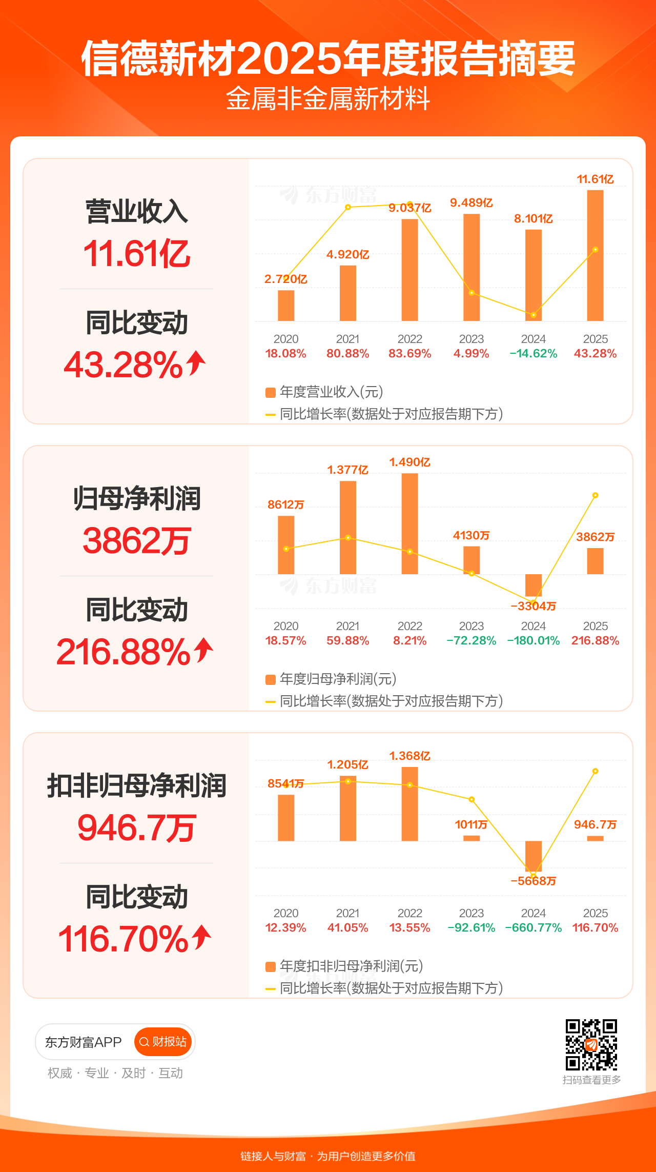 信德新材3月31日发布2025年年报显示,公司全年实现营业收入11.61亿元,同比增长43.28%;归母净利润3861.87万元,同比增长216.88%;扣非归母净利润946.66万元,同比增长116.70%。