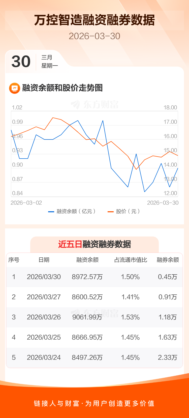 交易所最新数据显示,万控智造于2026年3月30日获融资买入880.96万元,融资偿还508.92万元,当日融资净买入372.05万元。目前,该股融资余额8972.57万,占流通市值比例为1.50%。