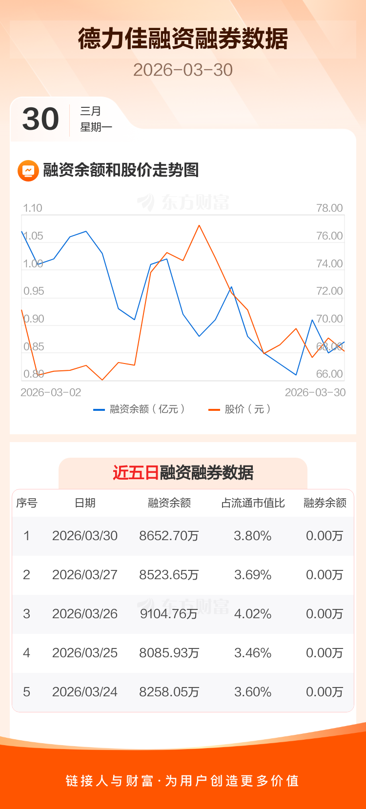 交易所最新数据显示,德力佳于2026年3月30日获融资买入1401.79万元,融资偿还1272.74万元,当日融资净买入129.05万元。目前,该股融资余额8652.70万,占流通市值比例为3.80%。