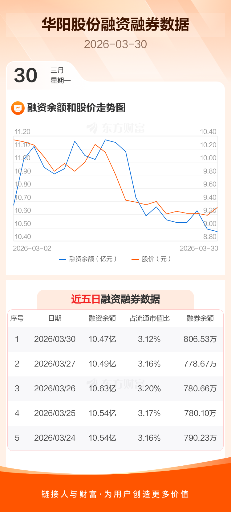 交易所最新数据显示,华阳股份于2026年3月30日获融资买入2738.98万元,融资偿还2951.32万元,当日融资净偿还212.34万元。目前,该股融资余额10.47亿,占流通市值比例为3.12%。