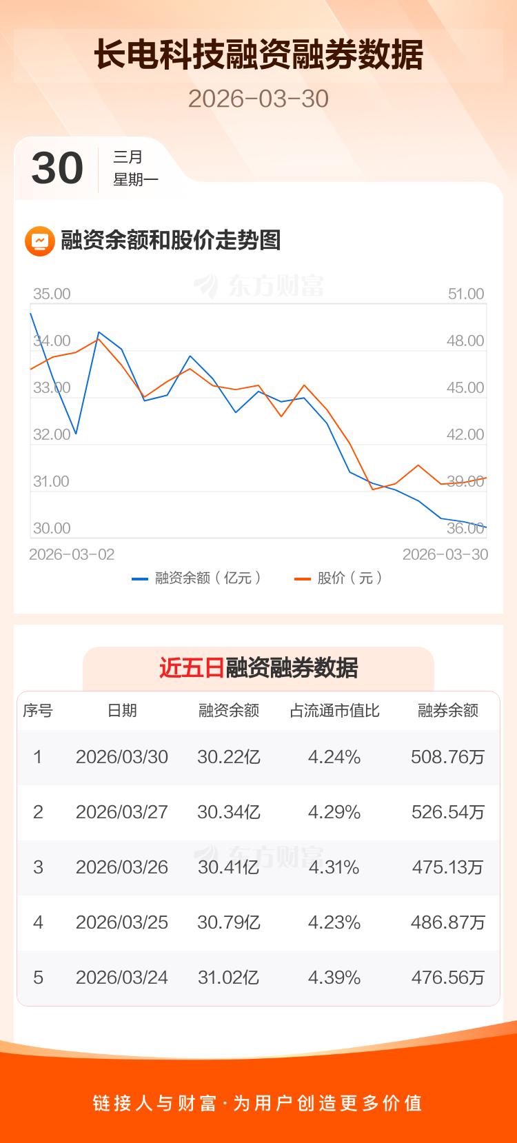 交易所最新数据显示,长电科技于2026年3月30日获融资买入1.15亿元,融资偿还1.27亿元,当日融资净偿还1207.1万元。目前,该股融资余额30.22亿,占流通市值比例为4.24%。