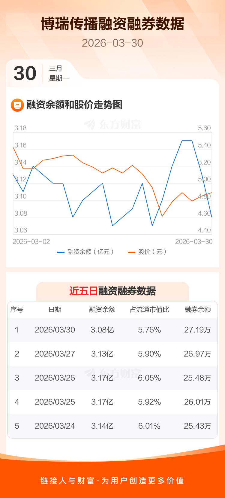 交易所最新数据显示,博瑞传播于2026年3月30日获融资买入474.11万元,融资偿还955.62万元,当日融资净偿还481.51万元。目前,该股融资余额3.08亿,占流通市值比例为5.76%。