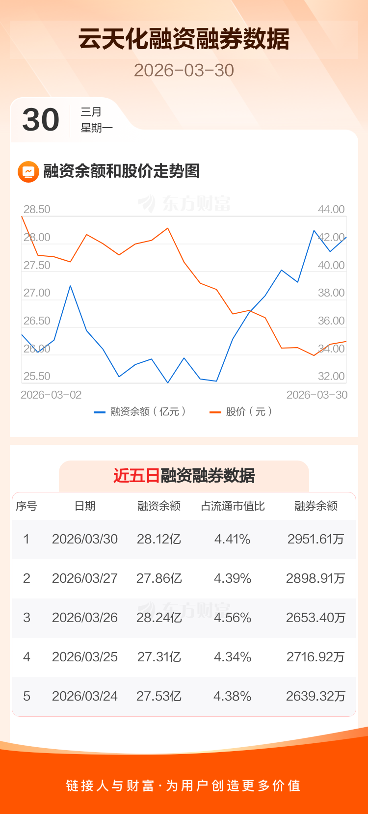 交易所最新数据显示,云天化于2026年3月30日获融资买入1.90亿元,融资偿还1.64亿元,当日融资净买入2601.79万元。目前,该股融资余额28.12亿,占流通市值比例为4.41%。