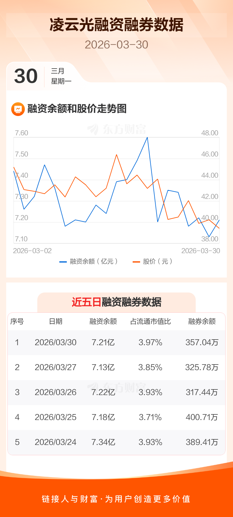 交易所最新数据显示,凌云光于2026年3月30日获融资买入3680.56万元,融资偿还2879.21万元,当日融资净买入801.36万元。目前,该股融资余额7.21亿,占流通市值比例为3.97%。