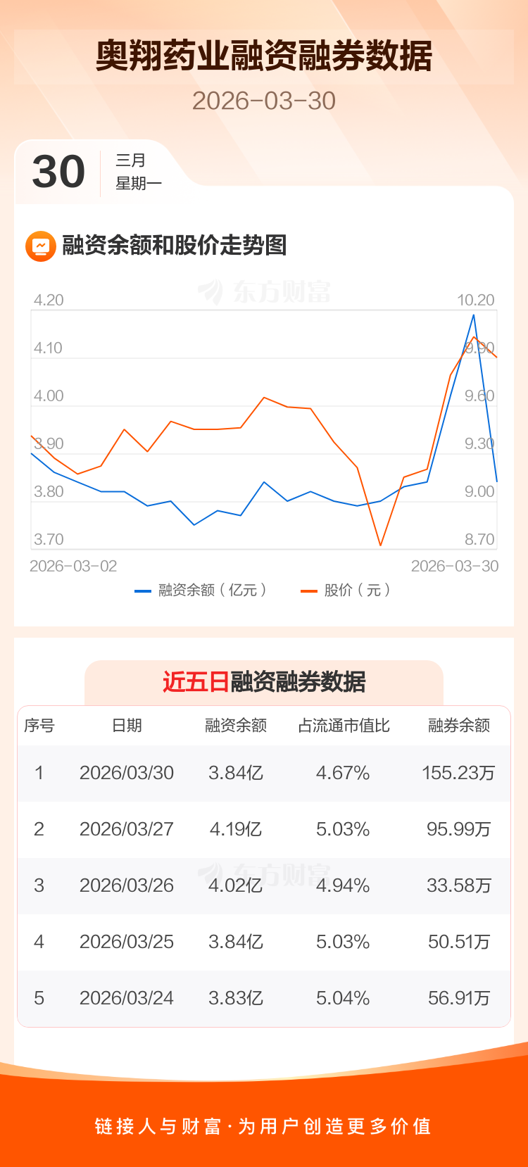 交易所最新数据显示,奥翔药业于2026年3月30日获融资买入784.55万元,融资偿还4316.89万元,当日融资净偿还3532.34万元。目前,该股融资余额3.84亿,占流通市值比例为4.67%。