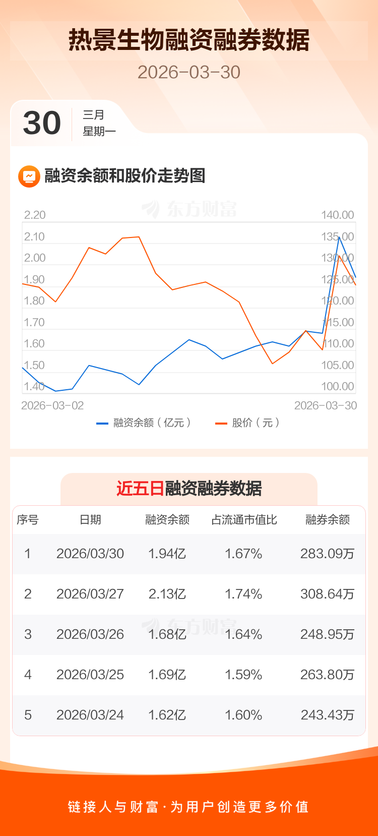 交易所最新数据显示,热景生物于2026年3月30日获融资买入4964.78万元,融资偿还6878.35万元,当日融资净偿还1913.56万元。目前,该股融资余额1.94亿,占流通市值比例为1.67%。