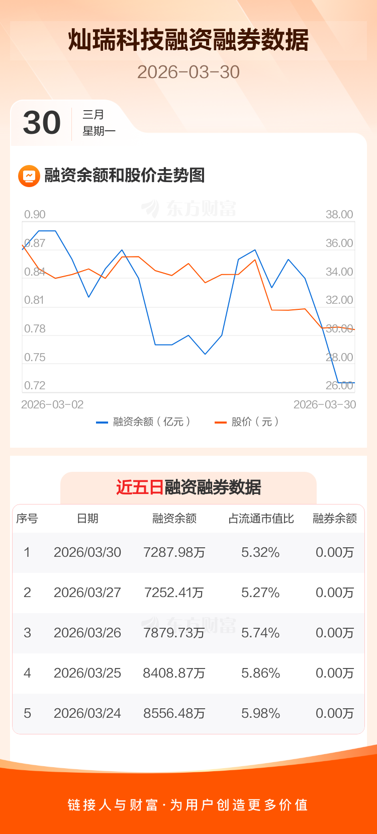 交易所最新数据显示,灿瑞科技于2026年3月30日获融资买入302.18万元,融资偿还266.62万元,当日融资净买入35.56万元。目前,该股融资余额7287.98万,占流通市值比例为5.32%。