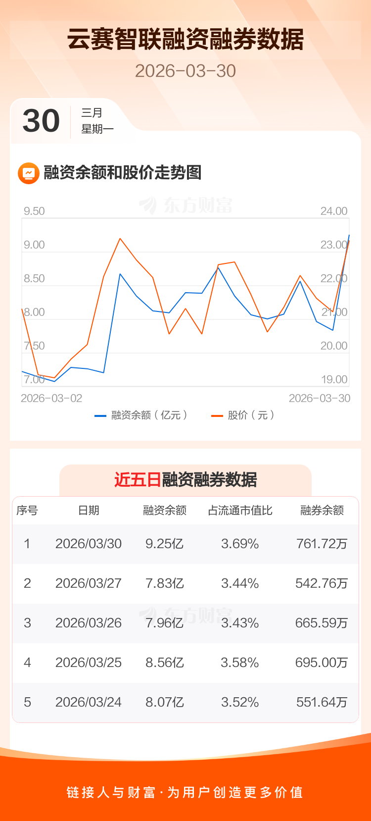 交易所最新数据显示,云赛智联于2026年3月30日获融资买入3.66亿元,融资偿还2.25亿元,当日融资净买入1.42亿元。目前,该股融资余额9.25亿,占流通市值比例为3.69%。