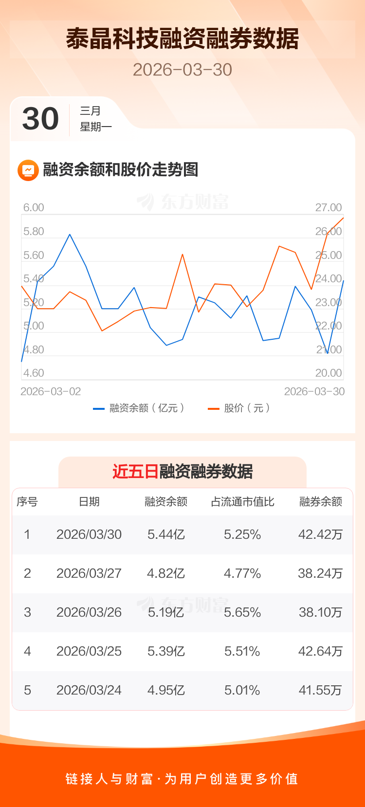 交易所最新数据显示,泰晶科技于2026年3月30日获融资买入1.81亿元,融资偿还1.20亿元,当日融资净买入6111.75万元。目前,该股融资余额5.44亿,占流通市值比例为5.25%。