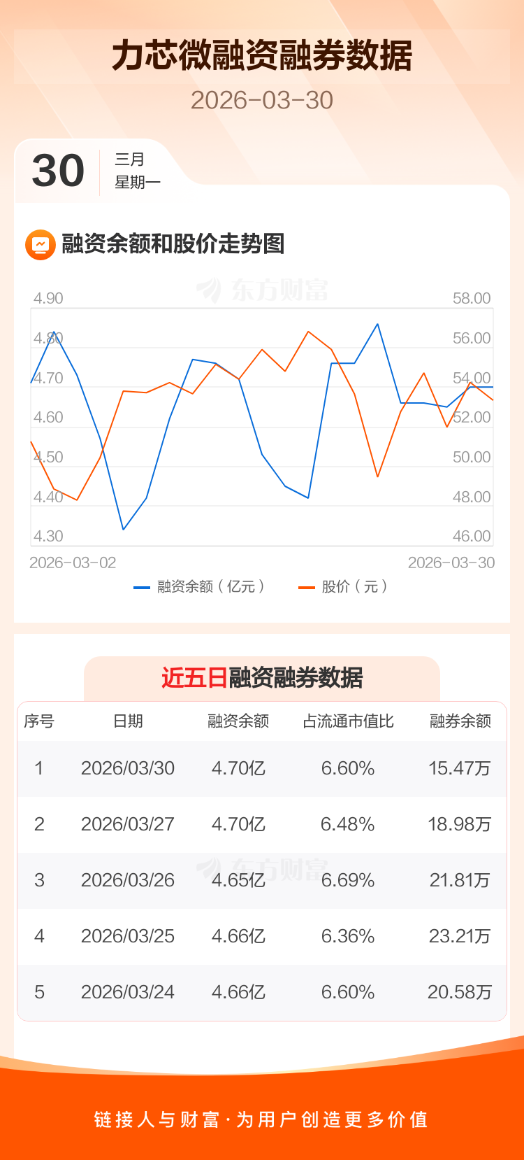交易所最新数据显示,力芯微于2026年3月30日获融资买入2696.70万元,融资偿还2621.65万元,当日融资净买入75.05万元。目前,该股融资余额4.70亿,占流通市值比例为6.60%。