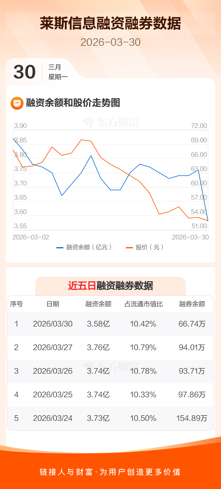 交易所最新数据显示,莱斯信息于2026年3月30日获融资买入710.79万元,融资偿还2508.32万元,当日融资净偿还1797.53万元。目前,该股融资余额3.58亿,占流通市值比例为10.42%。