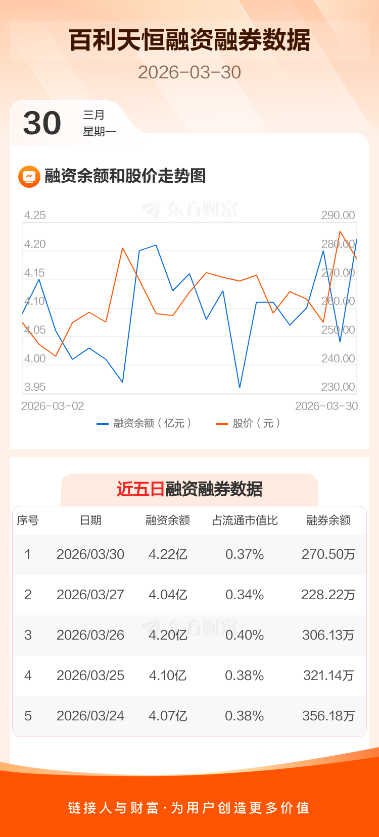 交易所最新数据显示,百利天恒于2026年3月30日获融资买入4500.82万元,融资偿还2708.90万元,当日融资净买入1791.92万元。目前,该股融资余额4.22亿,占流通市值比例为0.37%。