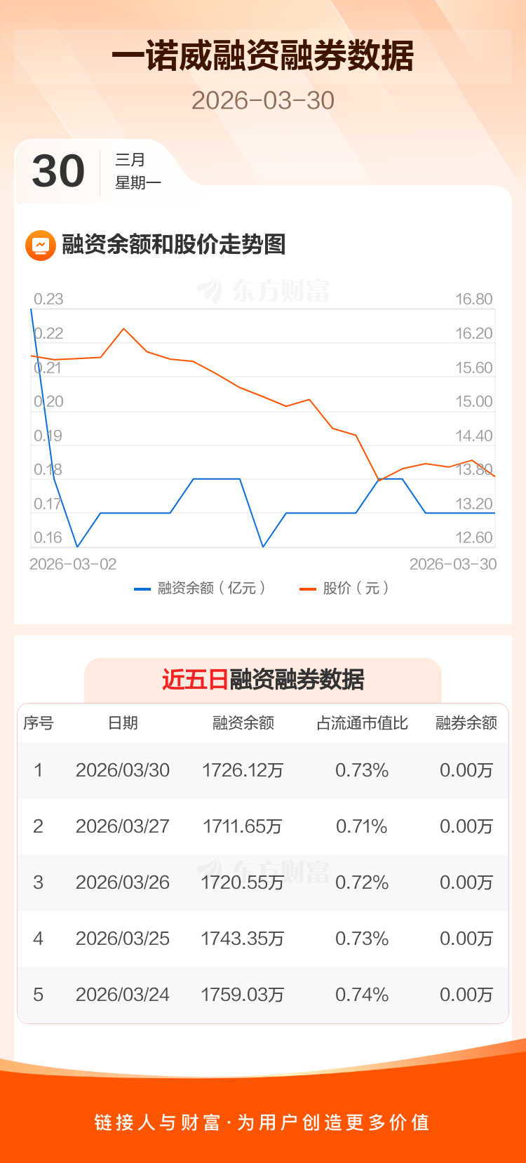 交易所最新数据显示,一诺威于2026年3月30日获融资买入30.88万元,融资偿还16.41万元,当日融资净买入14.47万元。目前,该股融资余额1726.12万,占流通市值比例为0.73%。