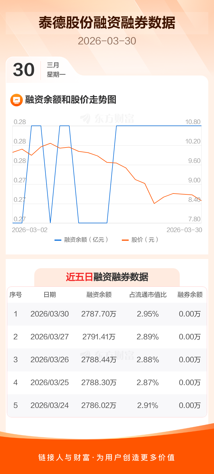 交易所最新数据显示,泰德股份于2026年3月30日获融资买入6.25万元,融资偿还9.96万元,当日融资净偿还3.71万元。目前,该股融资余额2787.70万,占流通市值比例为2.95%。