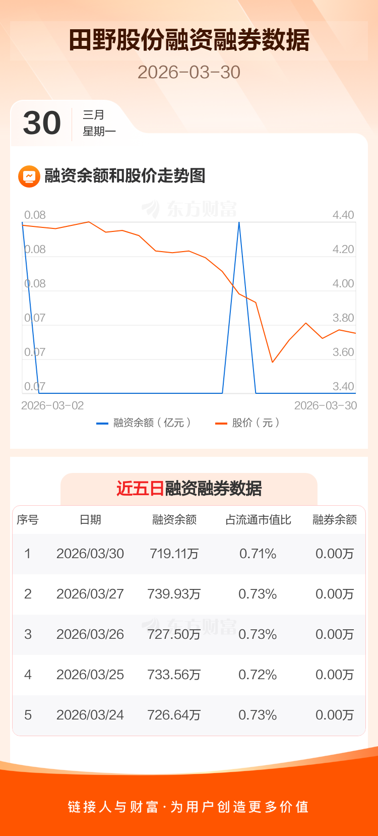 交易所最新数据显示,田野股份于2026年3月30日获融资买入0元,融资偿还20.82万元,当日融资净偿还20.82万元。目前,该股融资余额719.11万,占流通市值比例为0.71%。