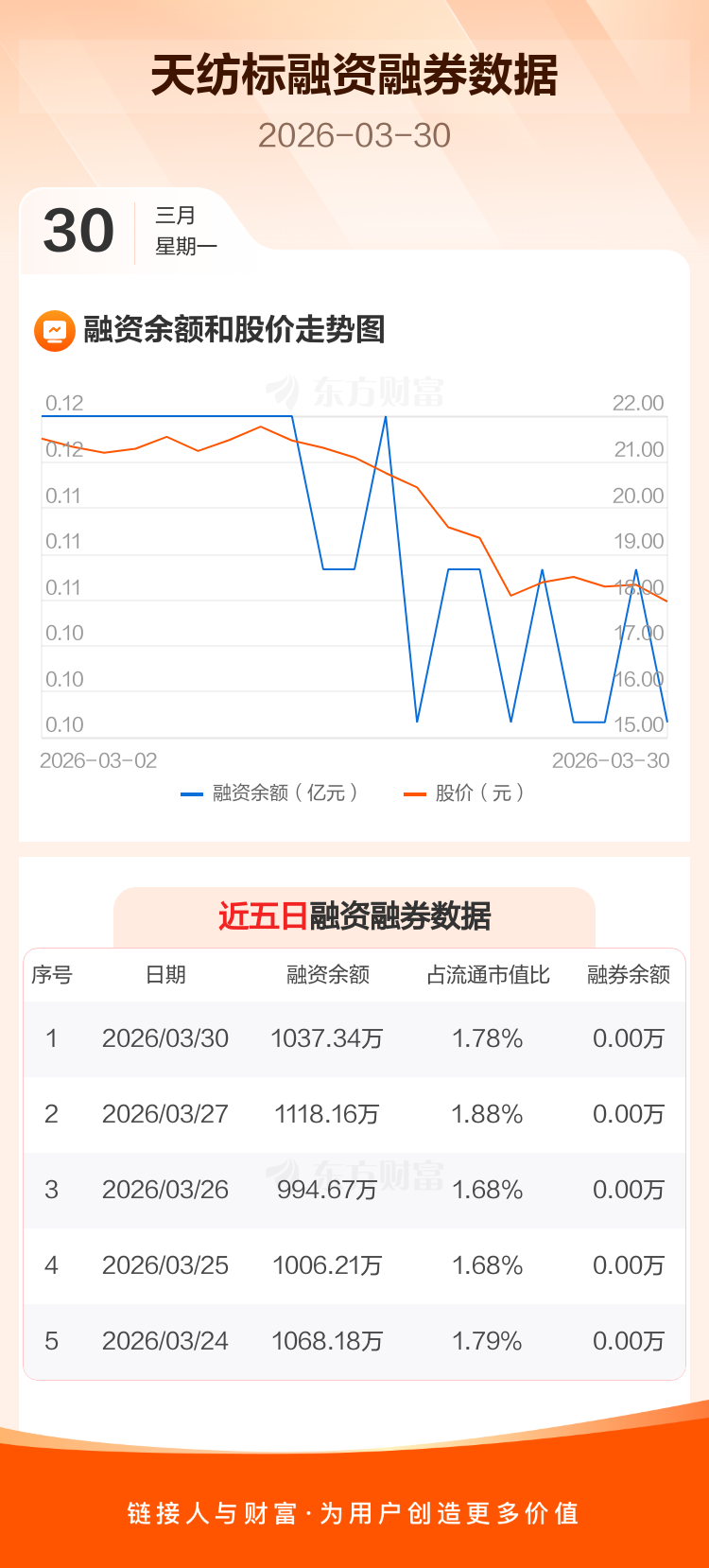 交易所最新数据显示,天纺标于2026年3月30日获融资买入77.03万元,融资偿还157.85万元,当日融资净偿还80.82万元。目前,该股融资余额1037.34万,占流通市值比例为1.78%。