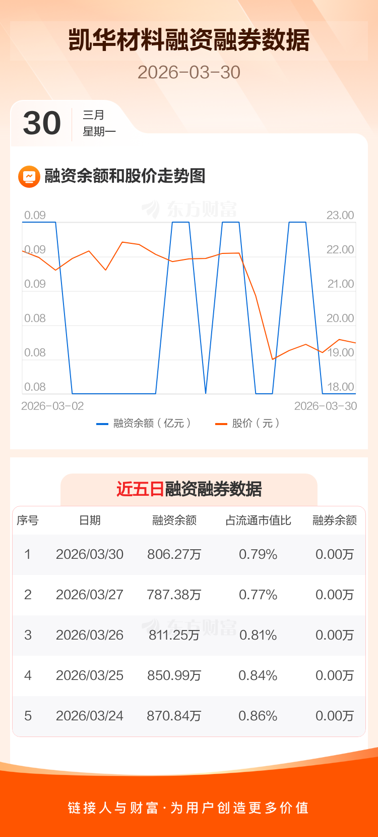 交易所最新数据显示,凯华材料于2026年3月30日获融资买入28.43万元,融资偿还9.55万元,当日融资净买入18.88万元。目前,该股融资余额806.27万,占流通市值比例为0.79%。