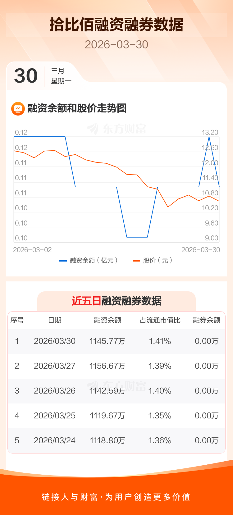 拾比佰:融资净偿还10.9万元,融资余额1145.77万元
