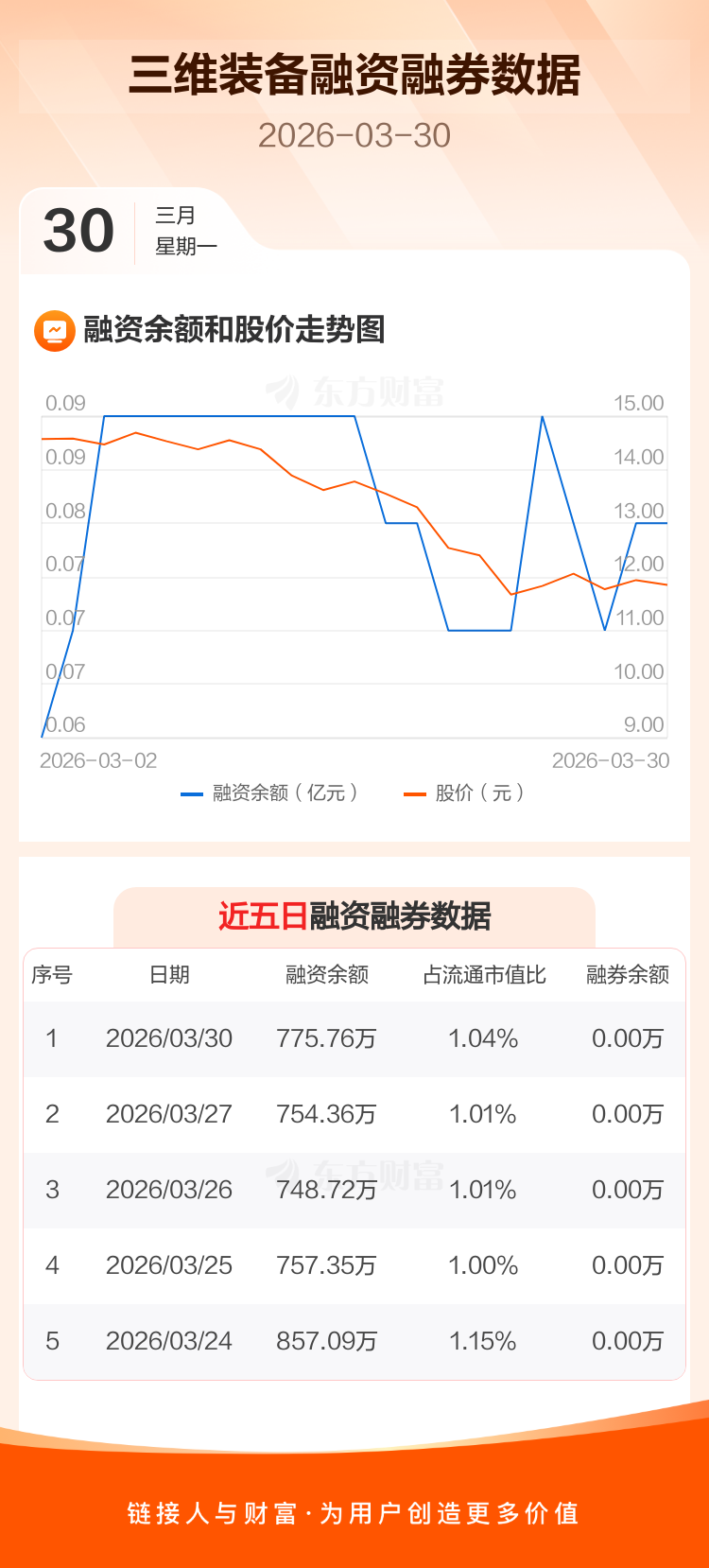 交易所最新数据显示,三维装备于2026年3月30日获融资买入61.07万元,融资偿还39.67万元,当日融资净买入21.4万元。目前,该股融资余额775.76万,占流通市值比例为1.04%。