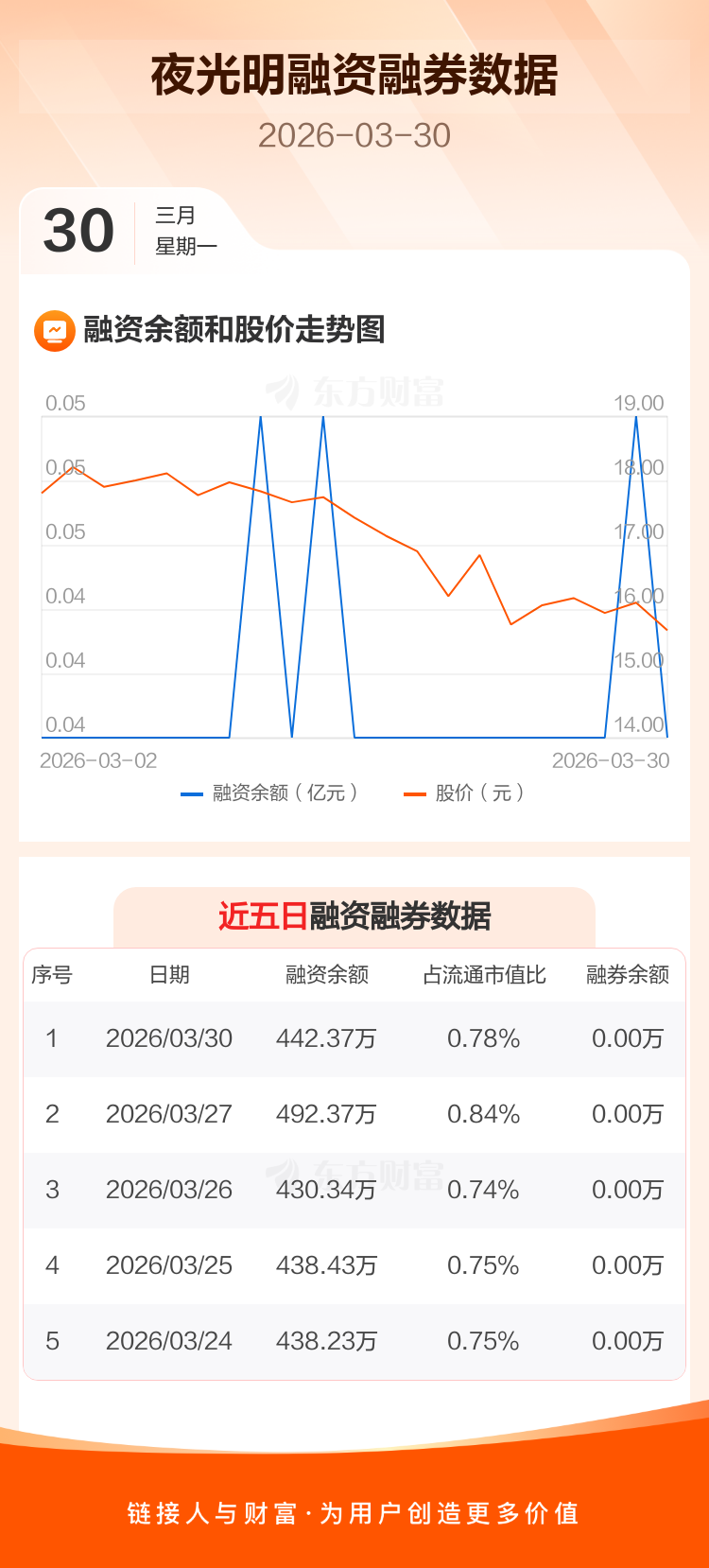 夜光明:融资净偿还50.01万元,融资余额442.37万元