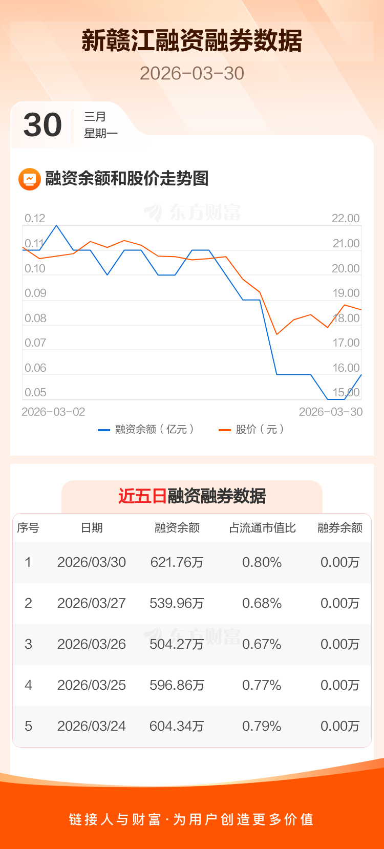交易所最新数据显示,新赣江于2026年3月30日获融资买入150.46万元,融资偿还68.67万元,当日融资净买入81.8万元。目前,该股融资余额621.76万,占流通市值比例为0.80%。