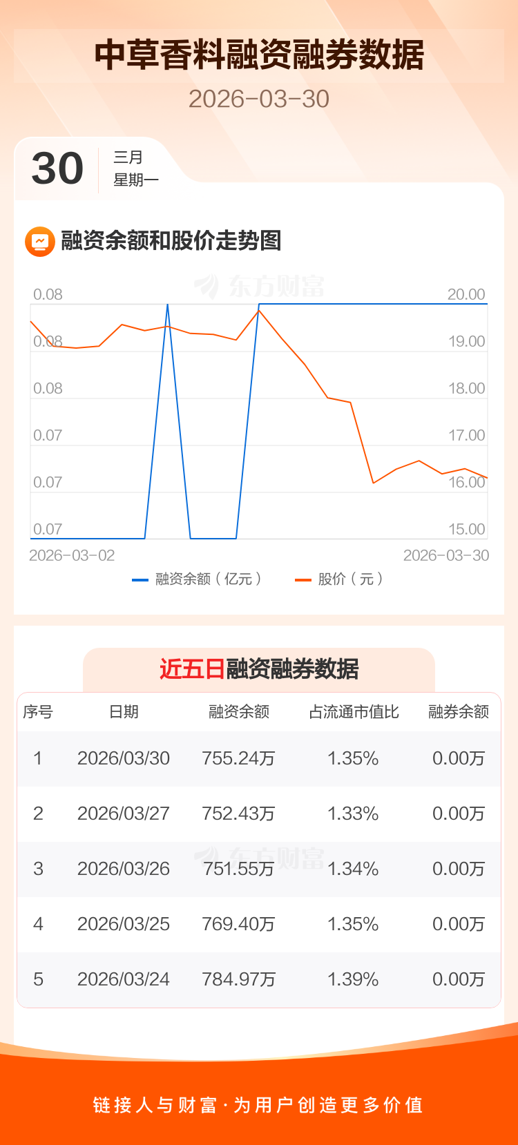 交易所最新数据显示,中草香料于2026年3月30日获融资买入3.75万元,融资偿还9432元,当日融资净买入2.81万元。目前,该股融资余额755.24万,占流通市值比例为1.35%。