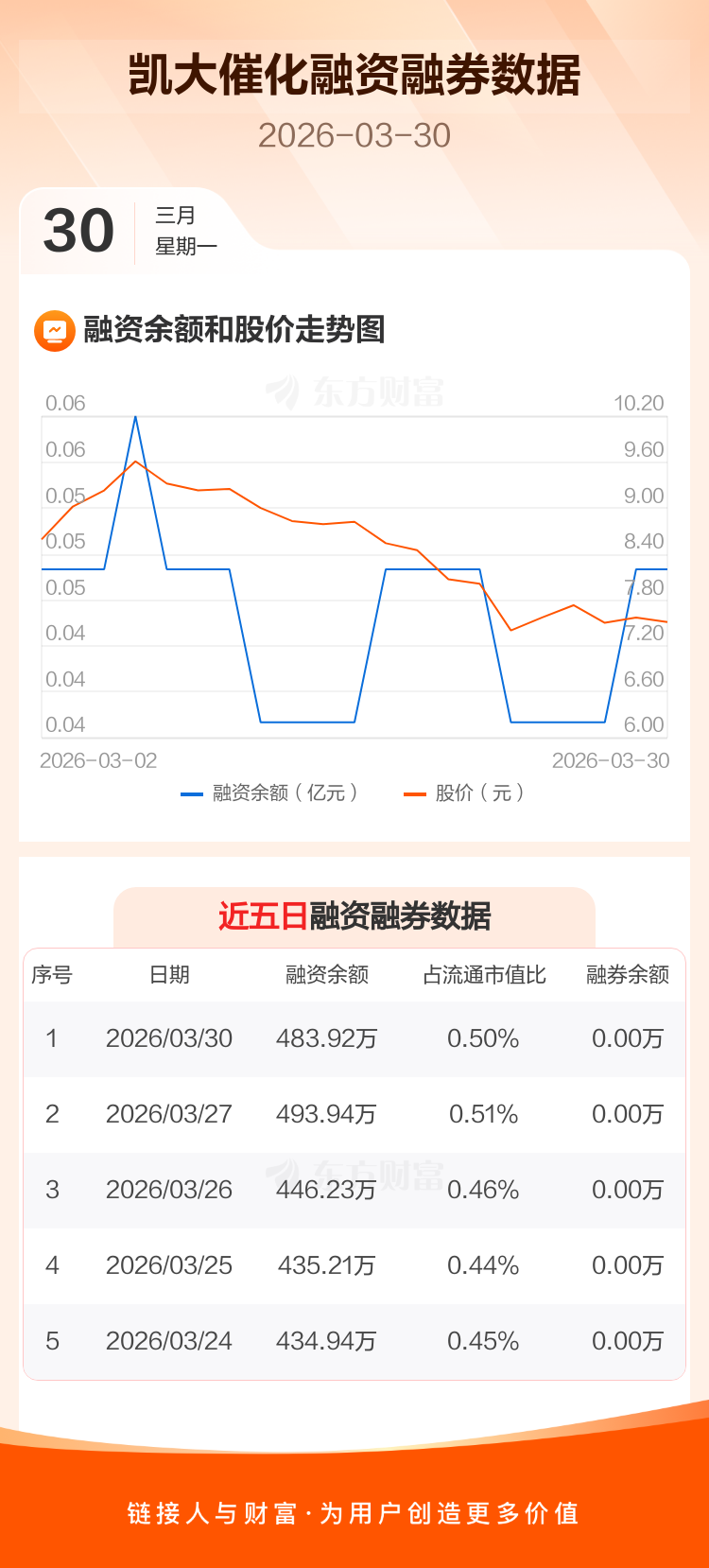 交易所最新数据显示,凯大催化于2026年3月30日获融资买入7.64万元,融资偿还17.65万元,当日融资净偿还10.02万元。目前,该股融资余额483.92万,占流通市值比例为0.50%。
