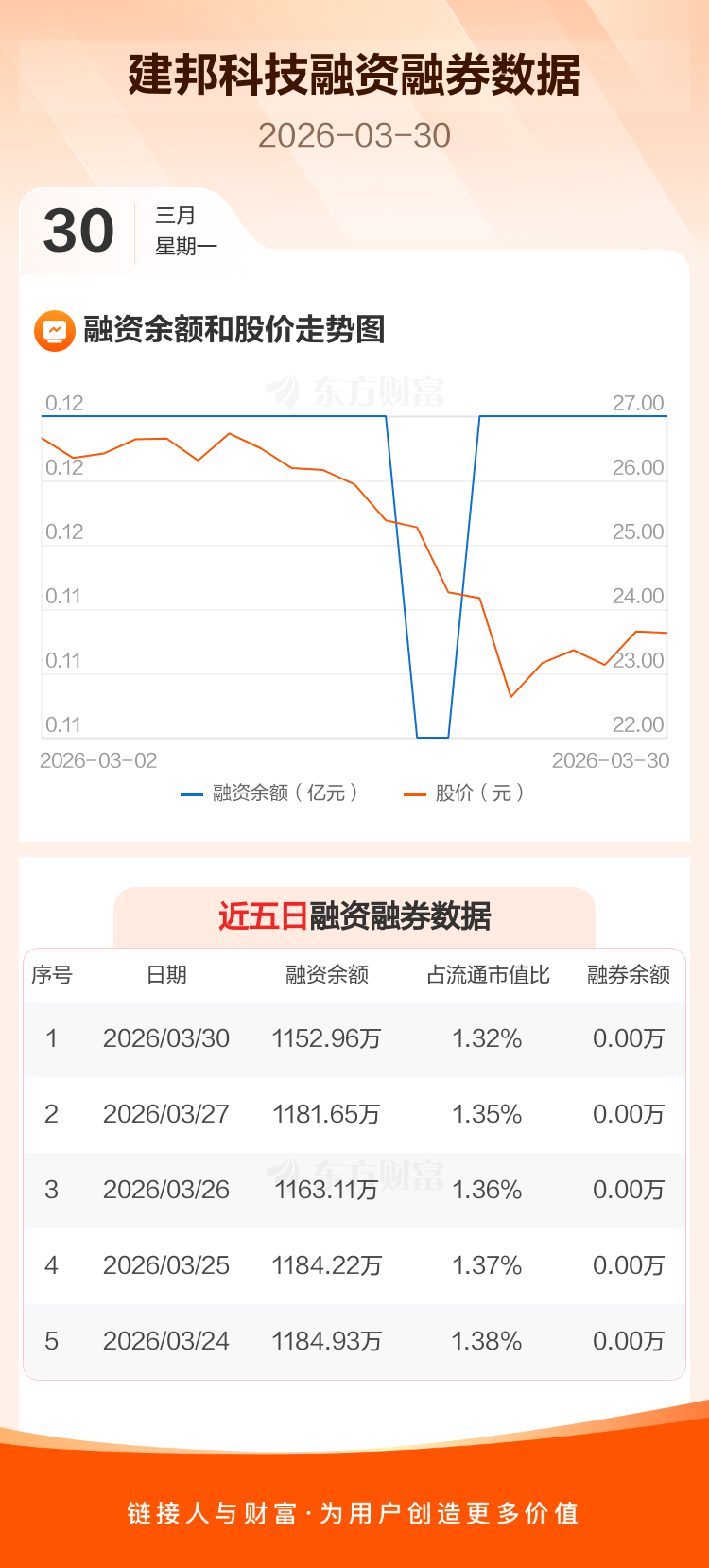 交易所最新数据显示,建邦科技于2026年3月30日获融资买入24.65万元,融资偿还53.34万元,当日融资净偿还28.69万元。目前,该股融资余额1152.96万,占流通市值比例为1.32%。